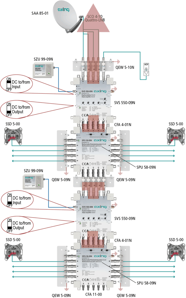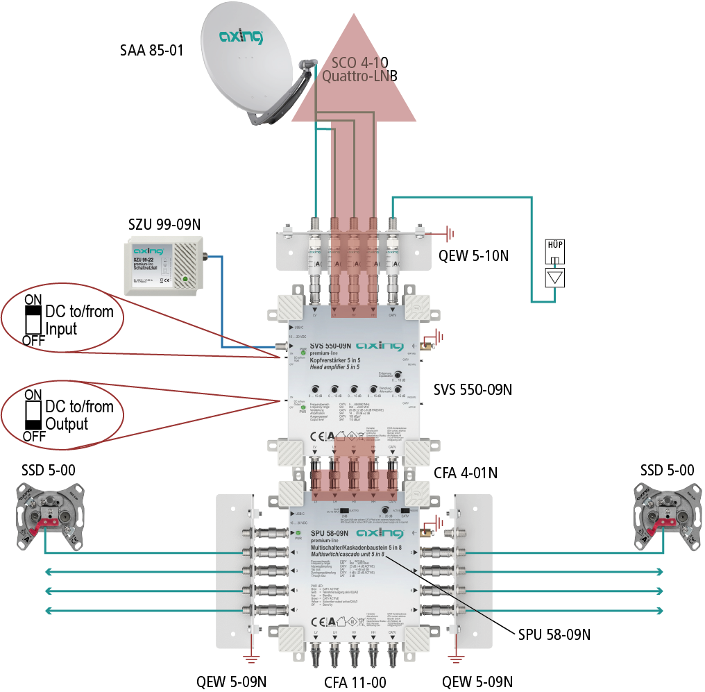 - Schließen Sie ein Netzteil SZU 99-09N jeweils an den DC-F-Buchsen der SVS 550-09N an.