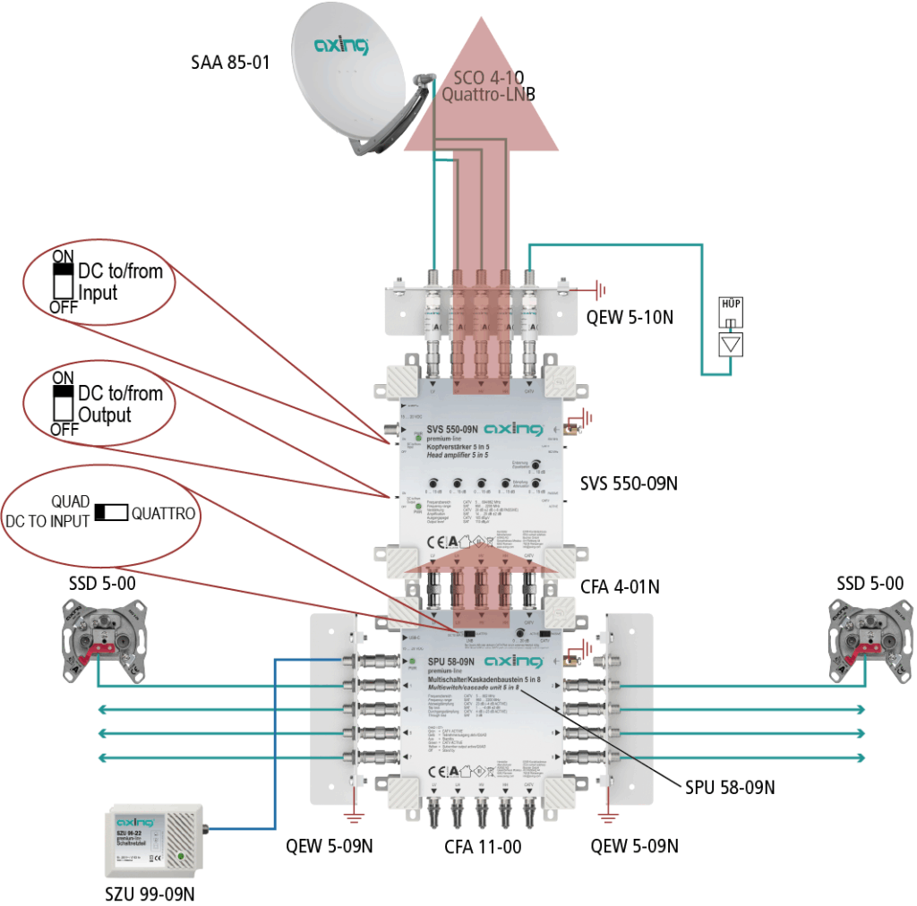 - Schalten Sie den LNB-Schalter des Multischalters auf QUAD/DC TO INPUT.